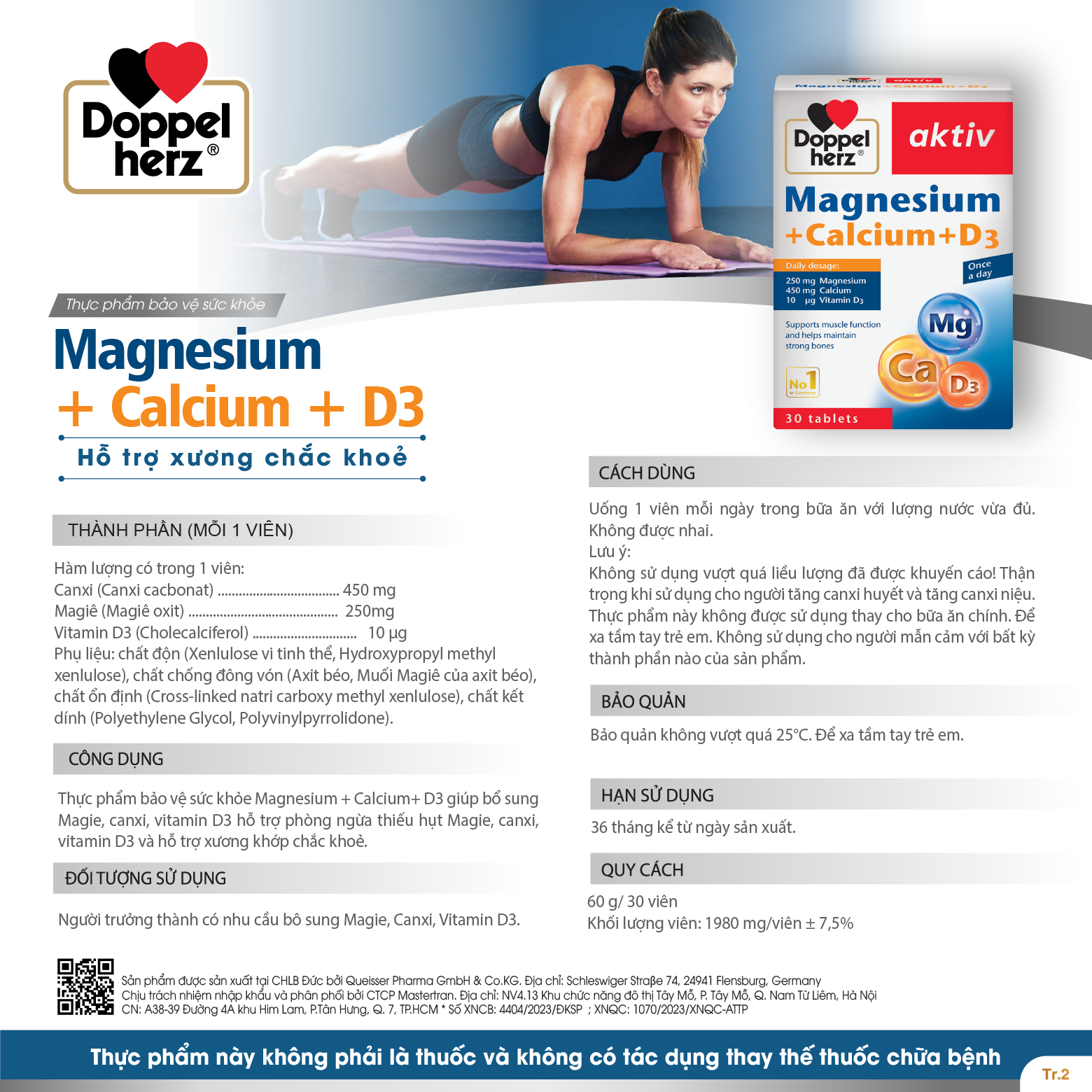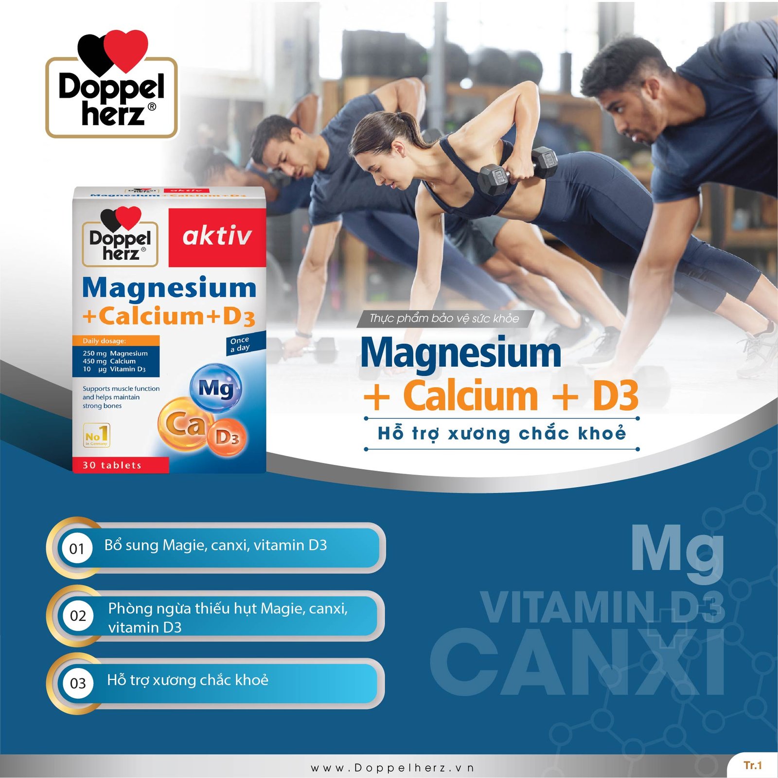 Công dụng Thực phẩm bảo vệ sức khỏe Magnesium + Calcium + D3 giúp bổ sung Magie, Canxi và Vitamin D3 hỗ trợ phòng ngừa thiếu hụt Magie, Canxi, Vitamin D3 và hỗ trợ xương khớp chắc khỏe